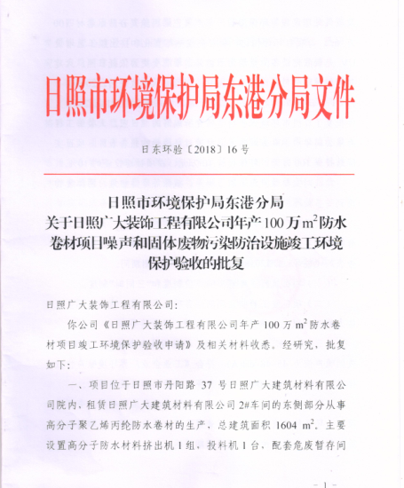 關(guān)于日照廣大裝飾工程有限公司年產(chǎn)100 萬 m2 防水卷材項目噪聲和固體廢物污染防治設(shè)施竣工環(huán)境保護驗收的批復(fù)